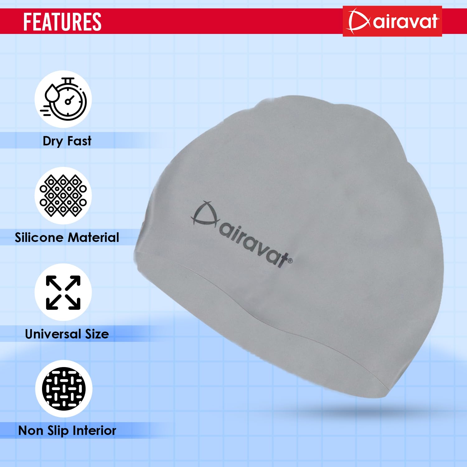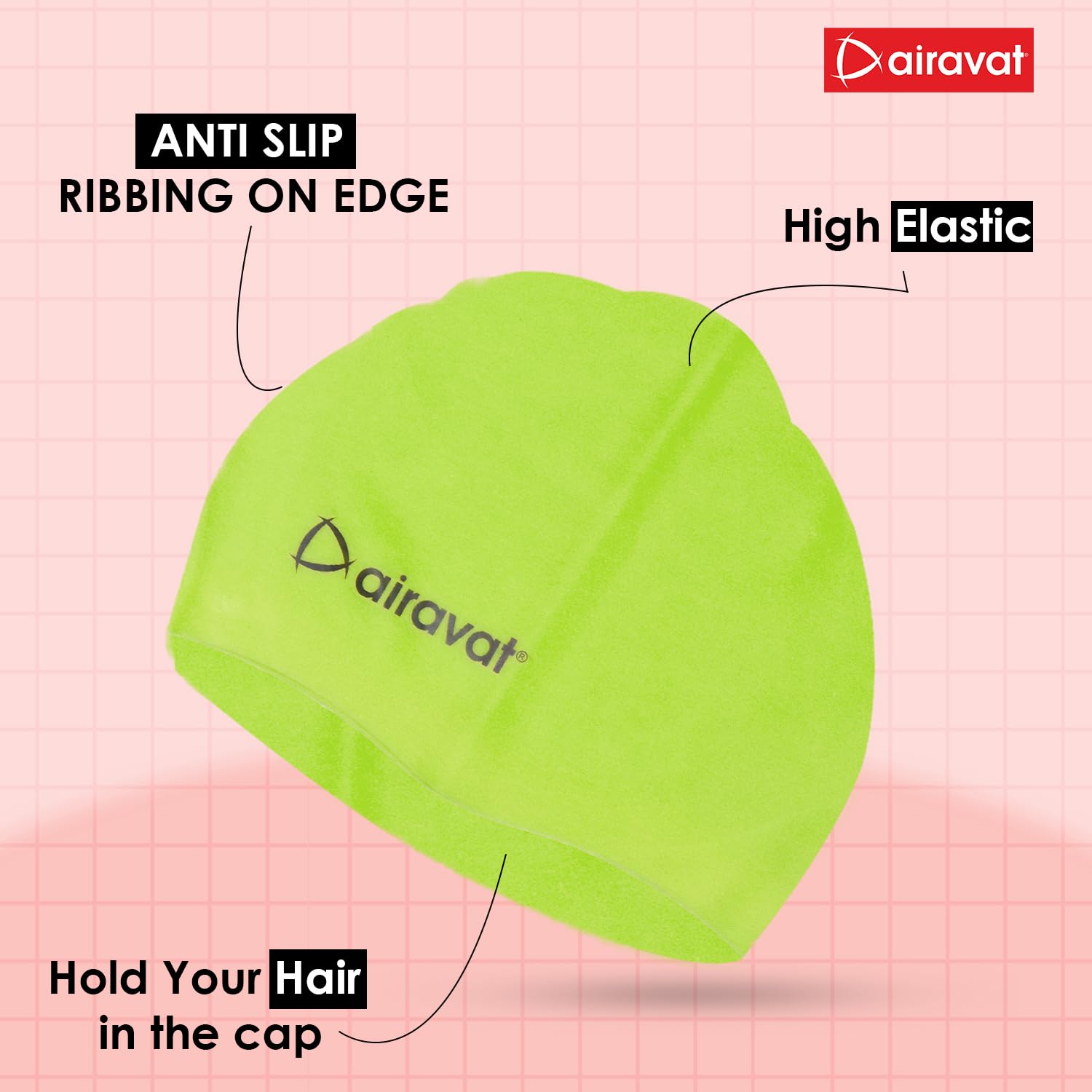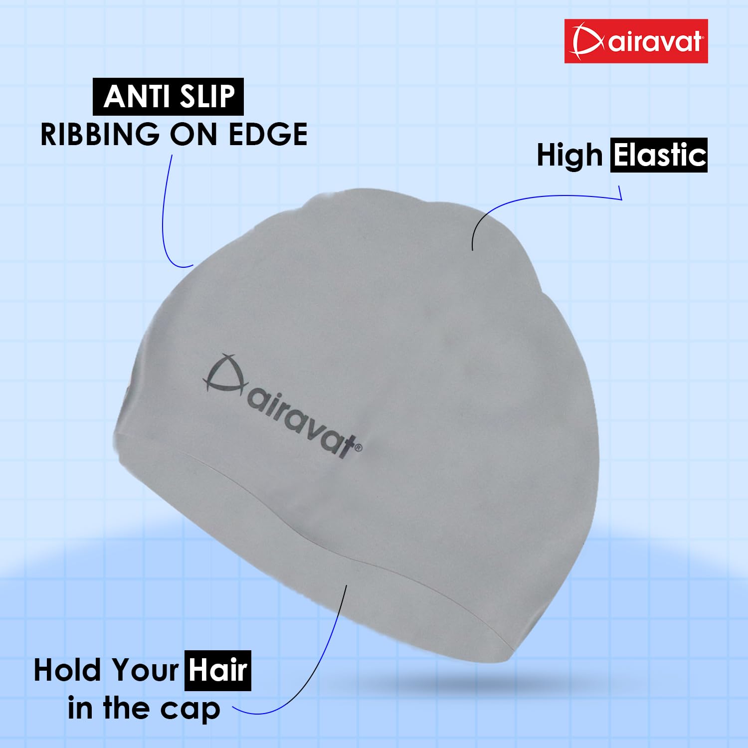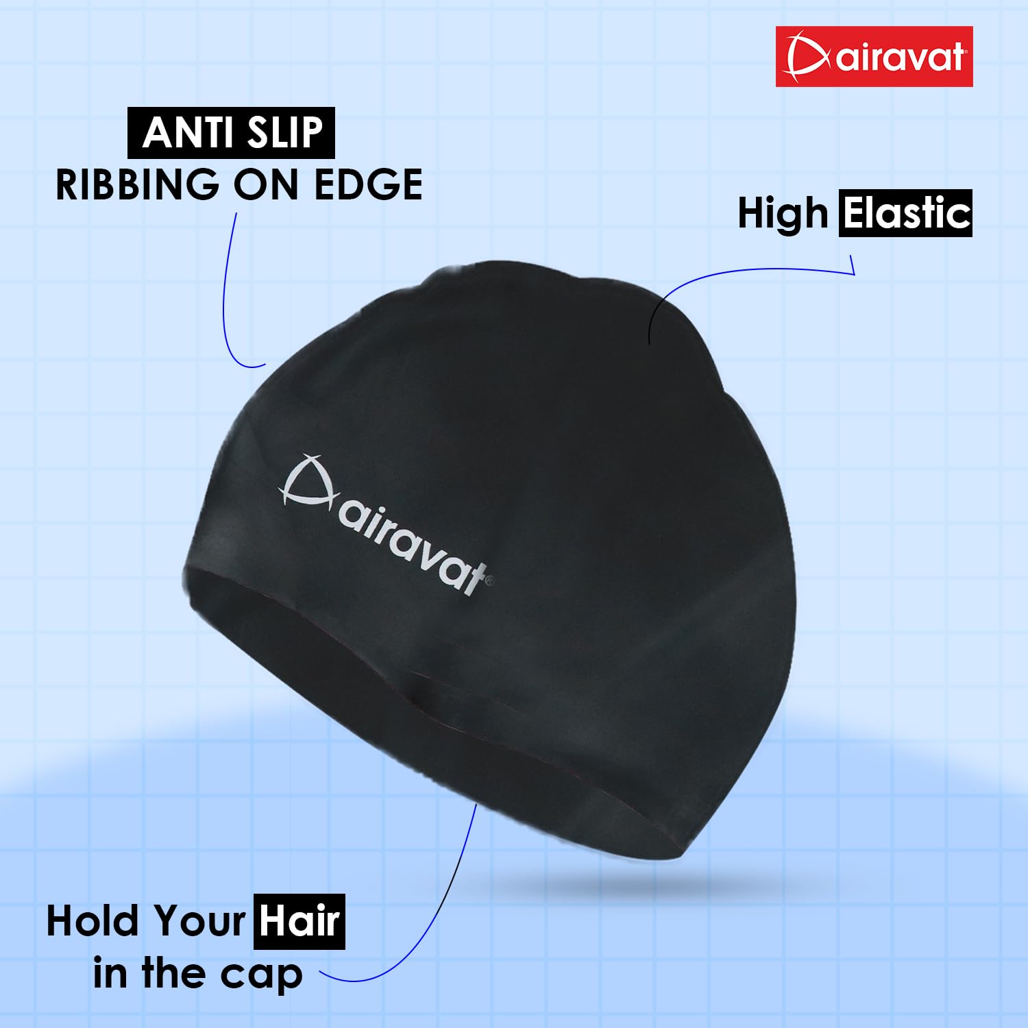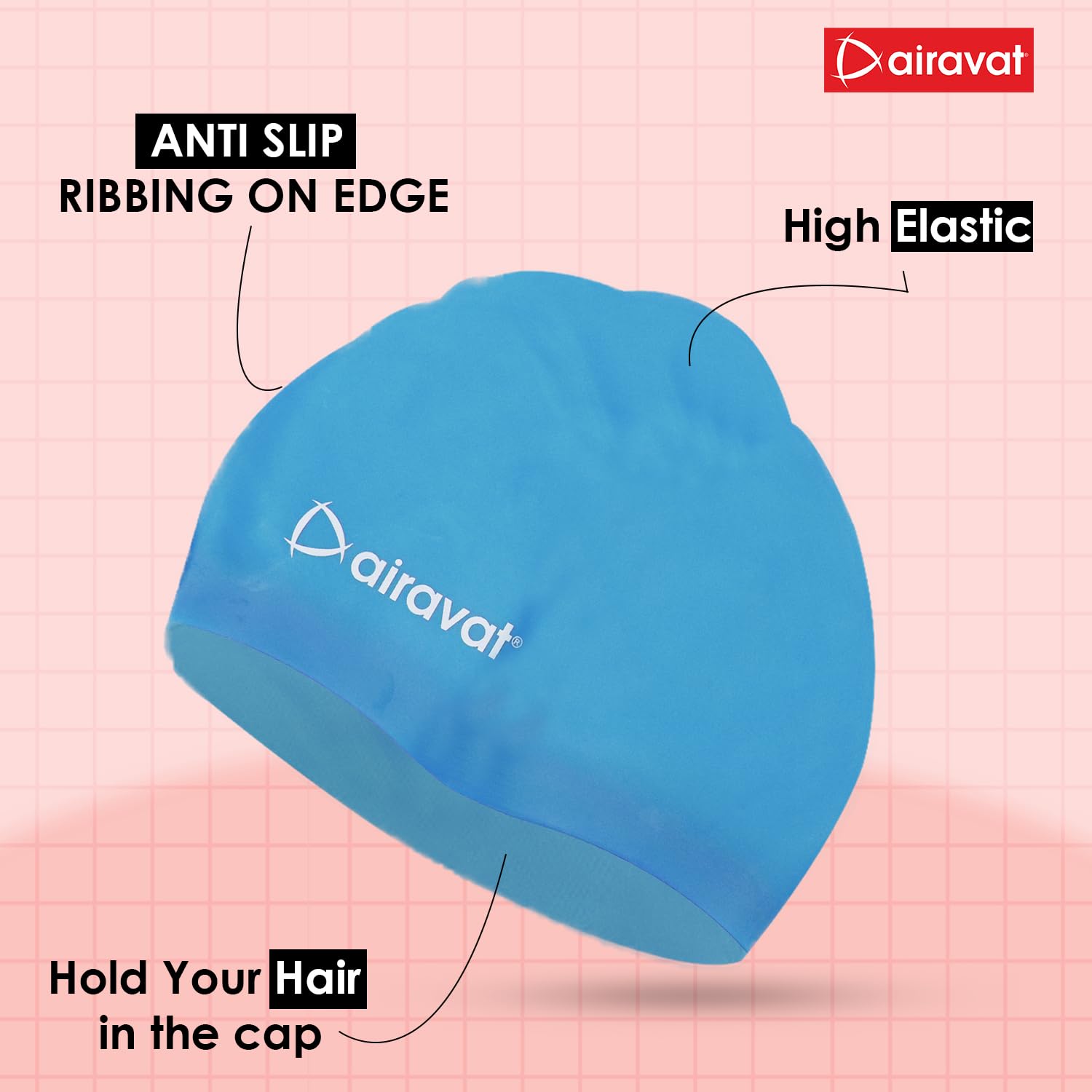 - SILICON MATERIAL: AIRAVAT Silicon swim cap is a popular material for swim caps due to its durability and flexibility. It's able to hold its shape over time and is resistant to chlorine and other chemicals in the pool.