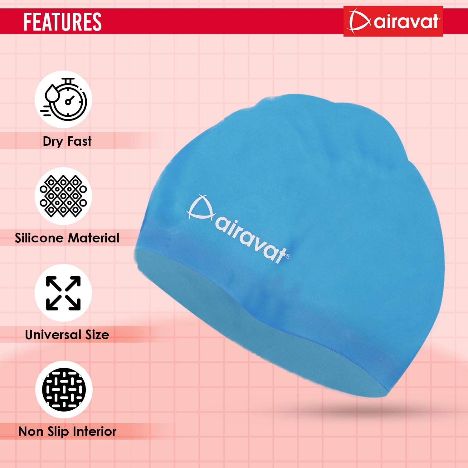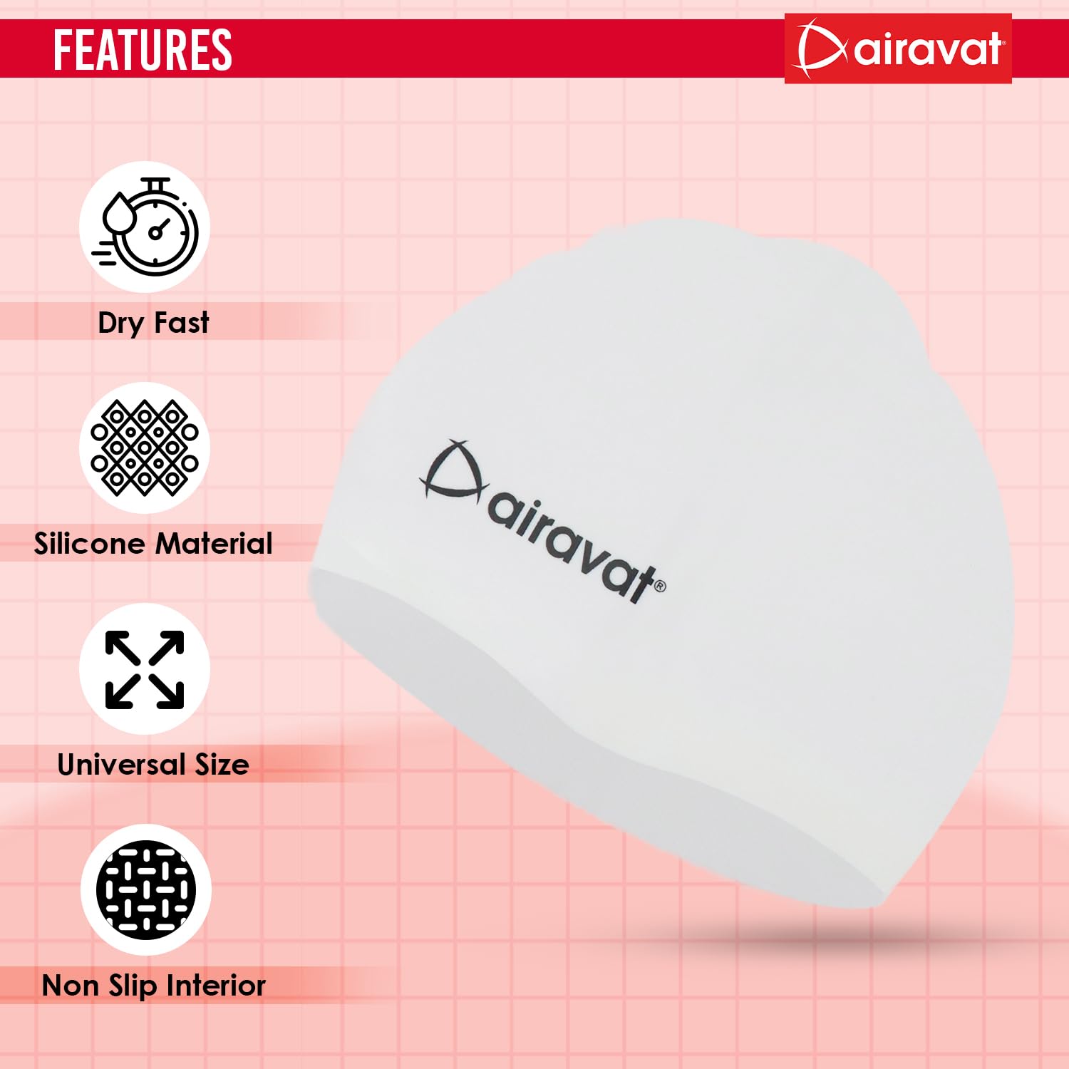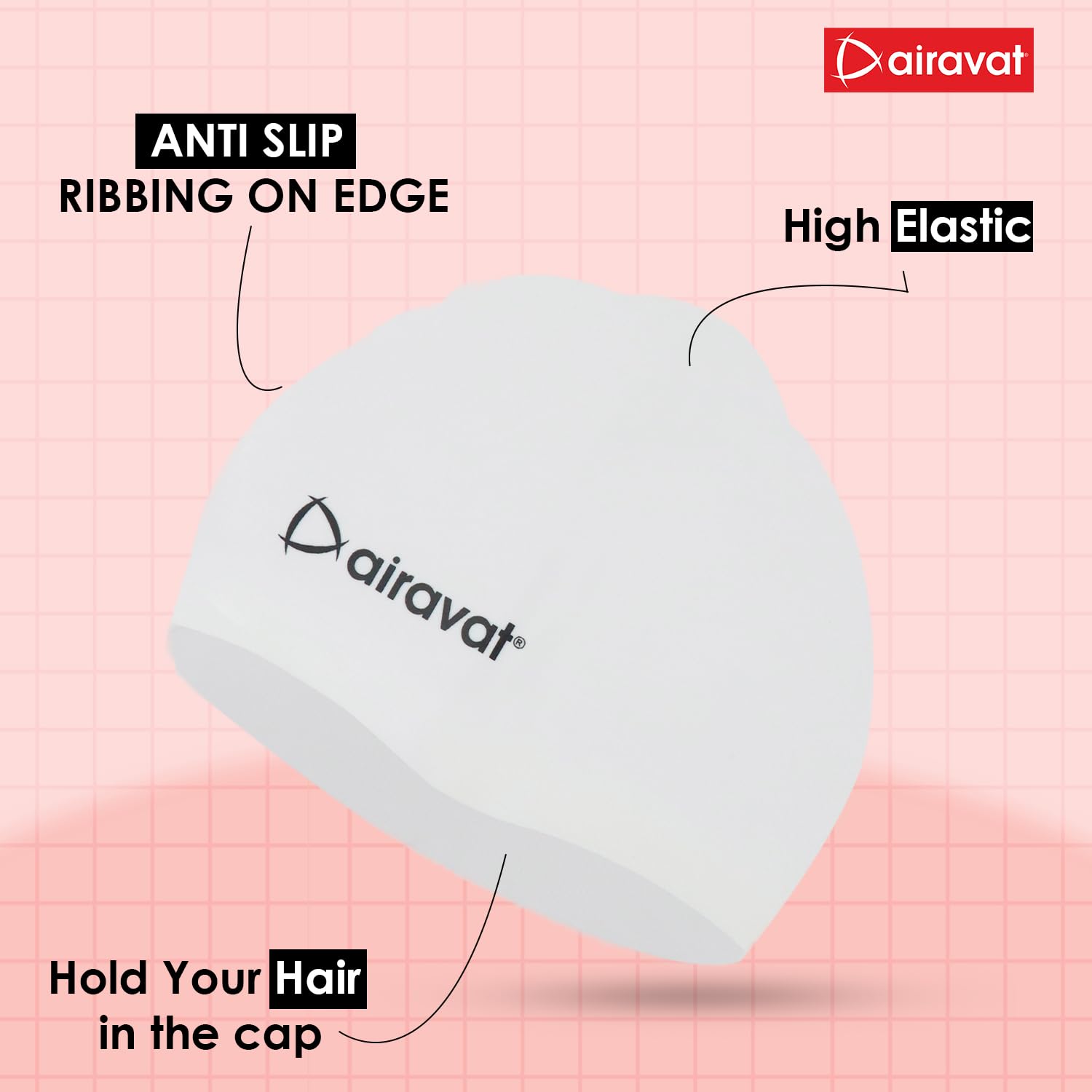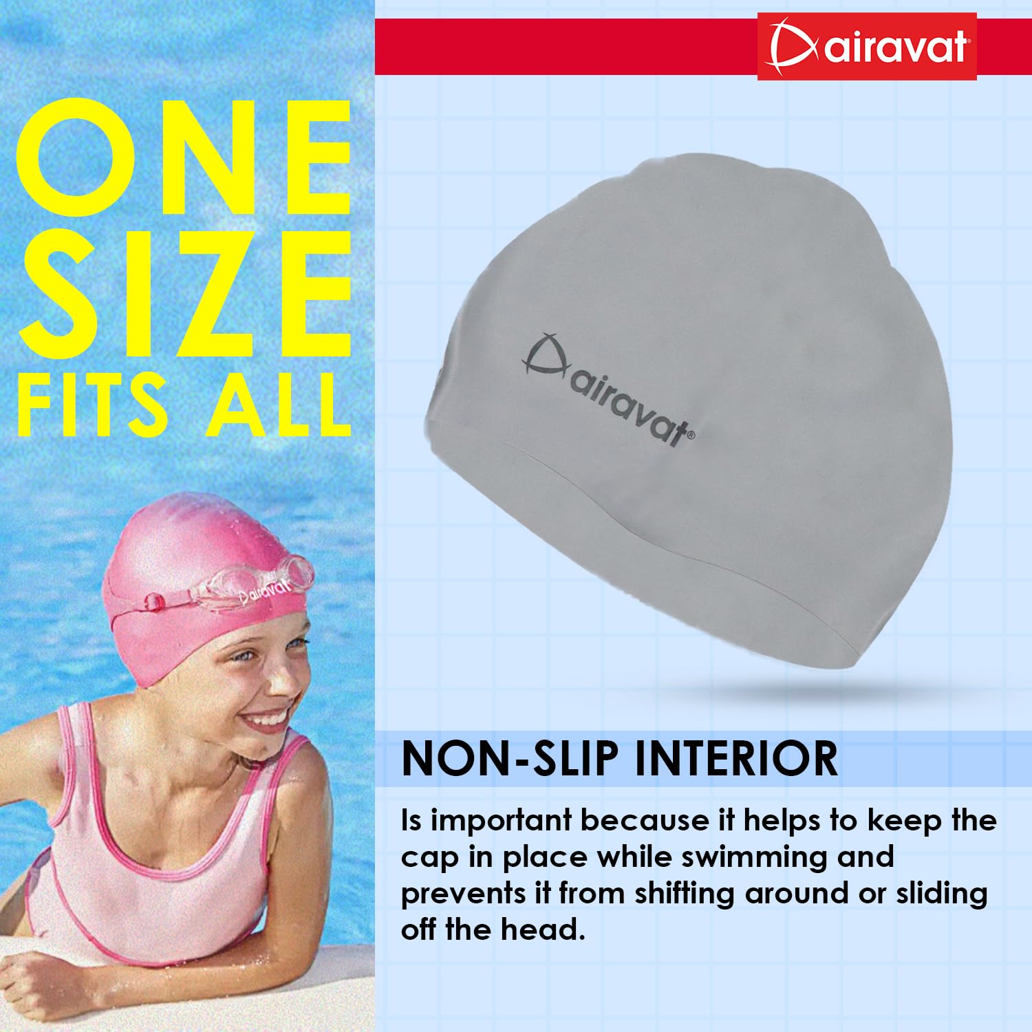 - SILICON MATERIAL: AIRAVAT Silicon swim cap is a popular material for swim caps due to its durability and flexibility. It's able to hold its shape over time and is resistant to chlorine and other chemicals in the pool.