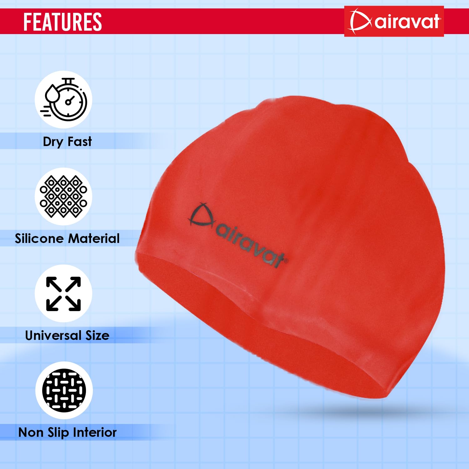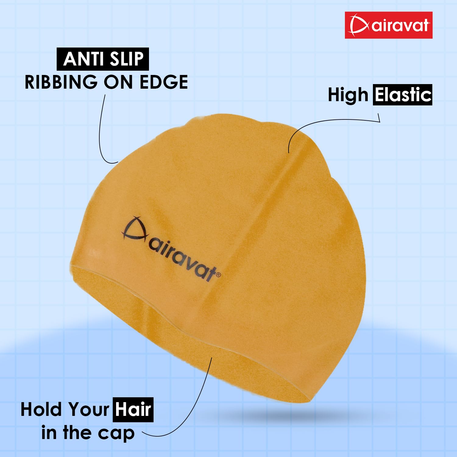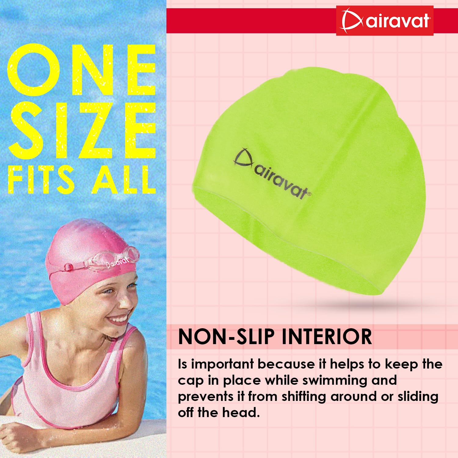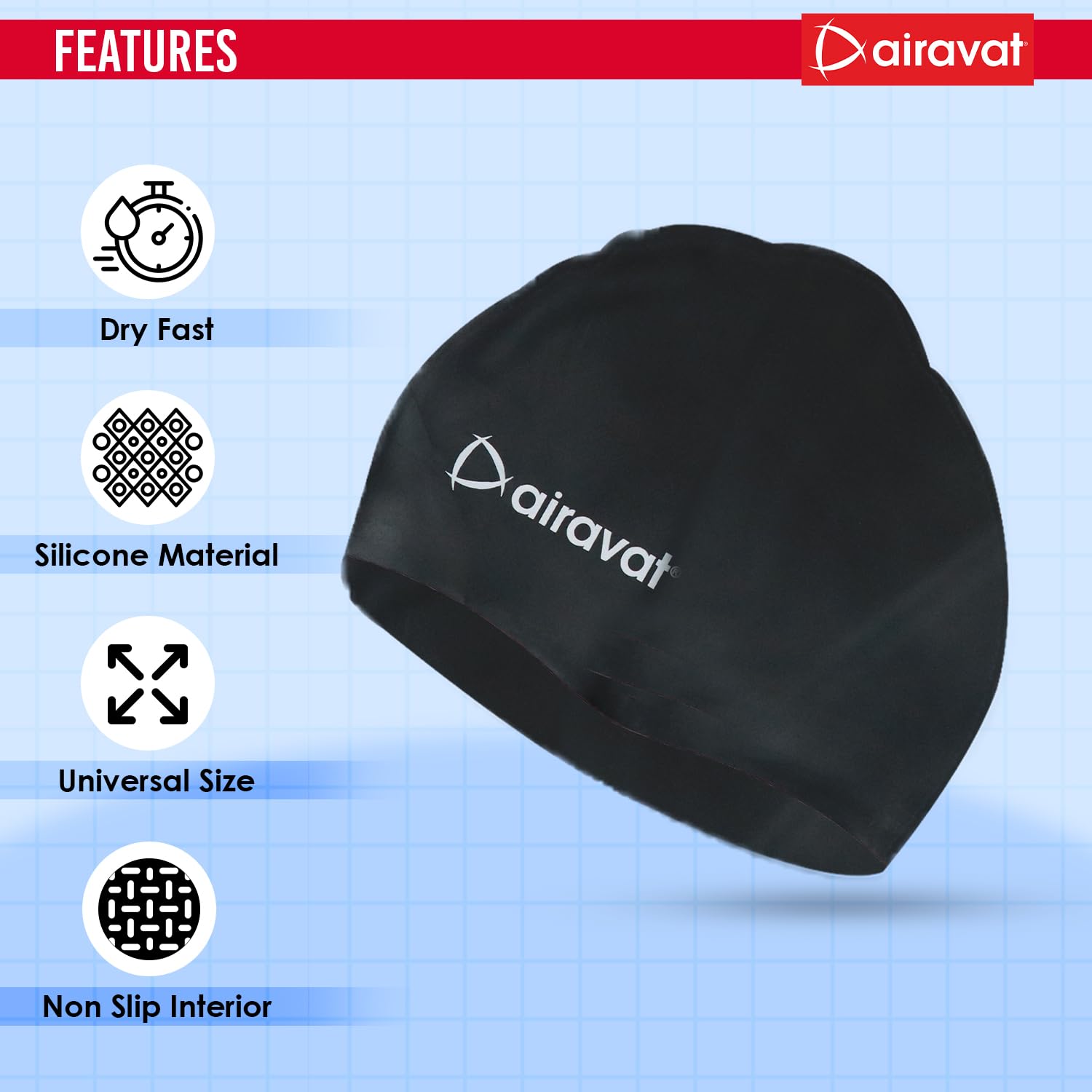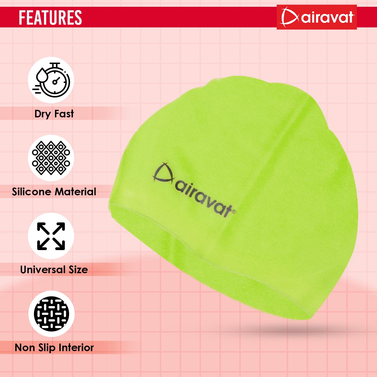 - SILICON MATERIAL: AIRAVAT Silicon swim cap is a popular material for swim caps due to its durability and flexibility. It's able to hold its shape over time and is resistant to chlorine and other chemicals in the pool.