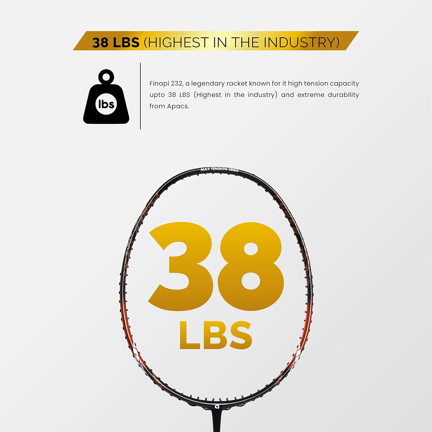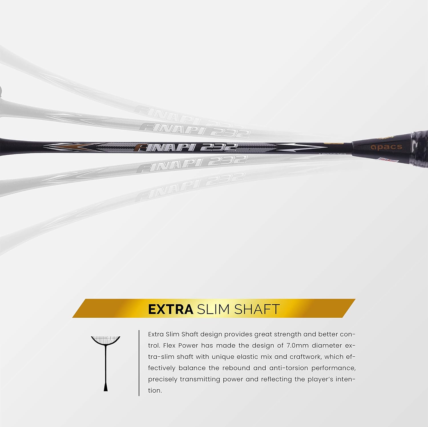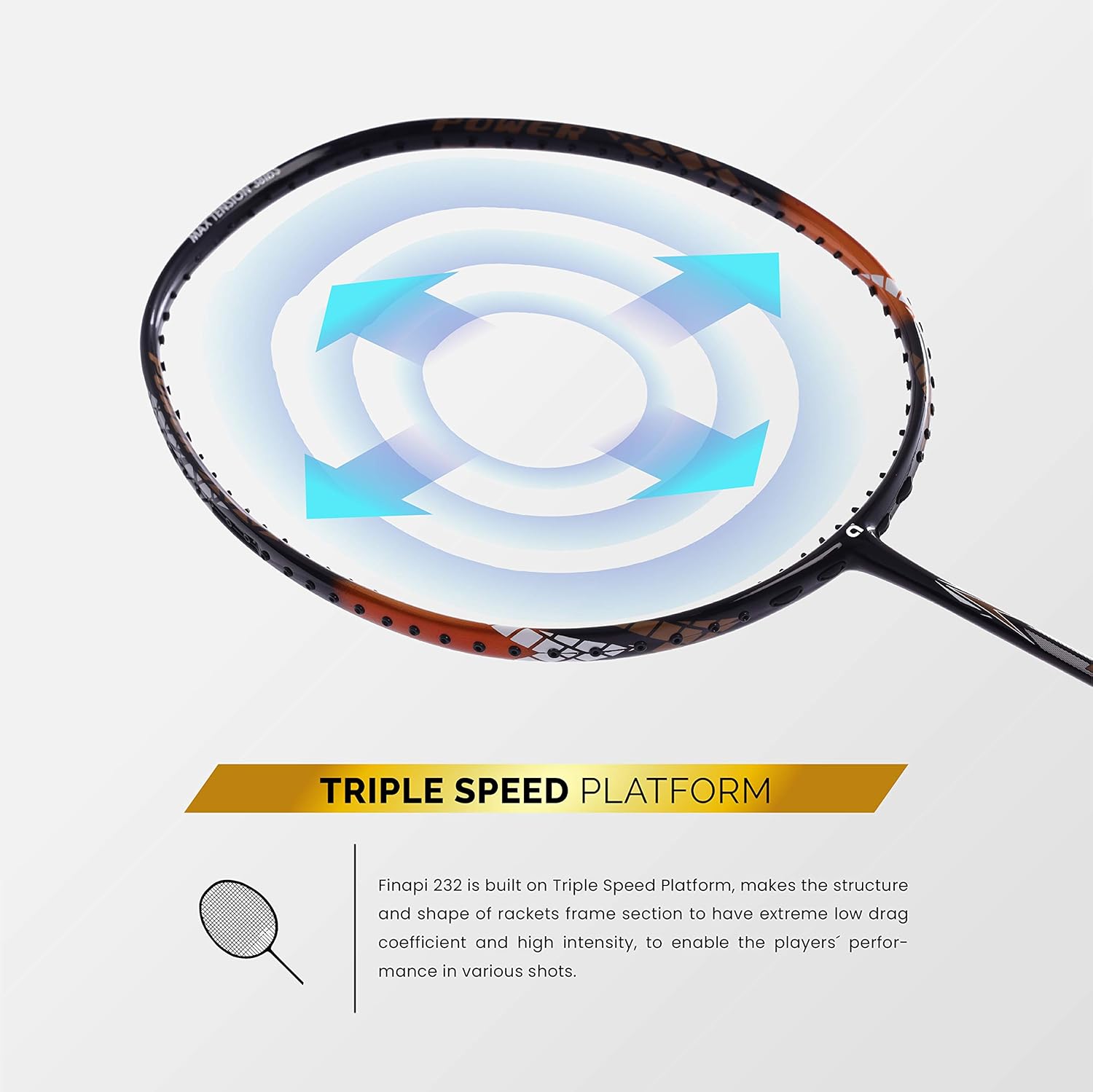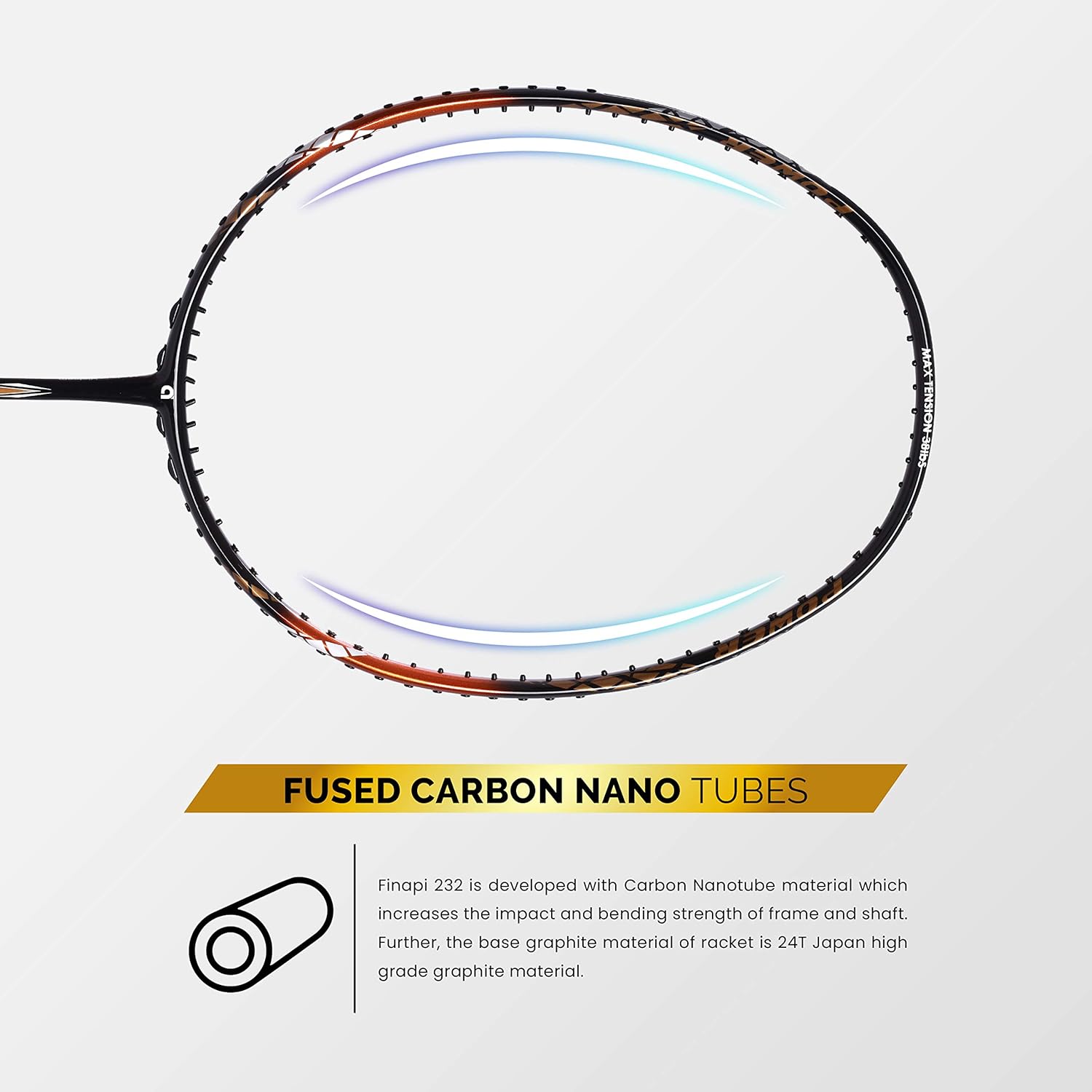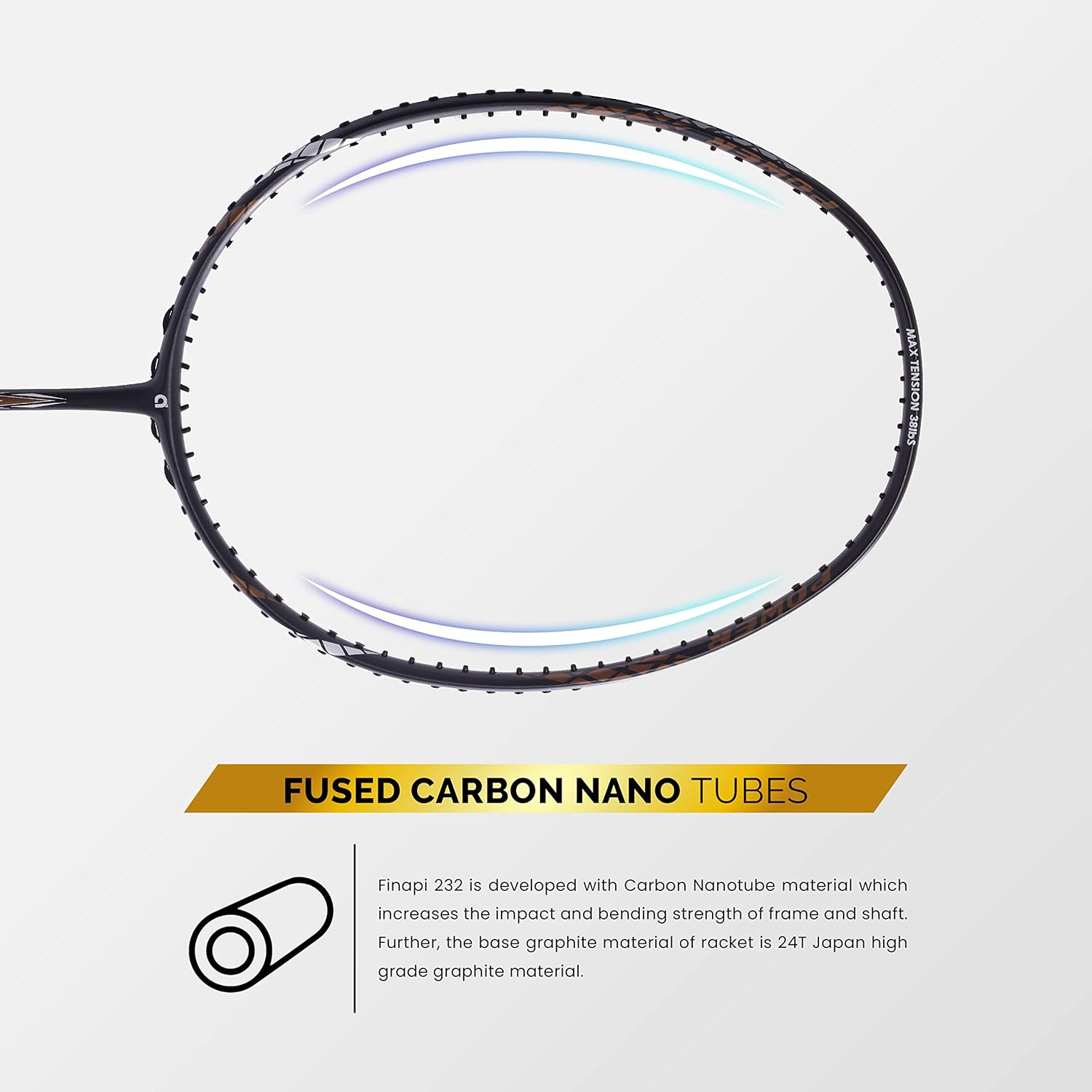 - fused carbon nano tubes: finapi 232 is developed with carbon nanotube material which increases the impact and bending strength of frame and shaft. further, the base graphite material of racket is 24t japan high grade graphite material.