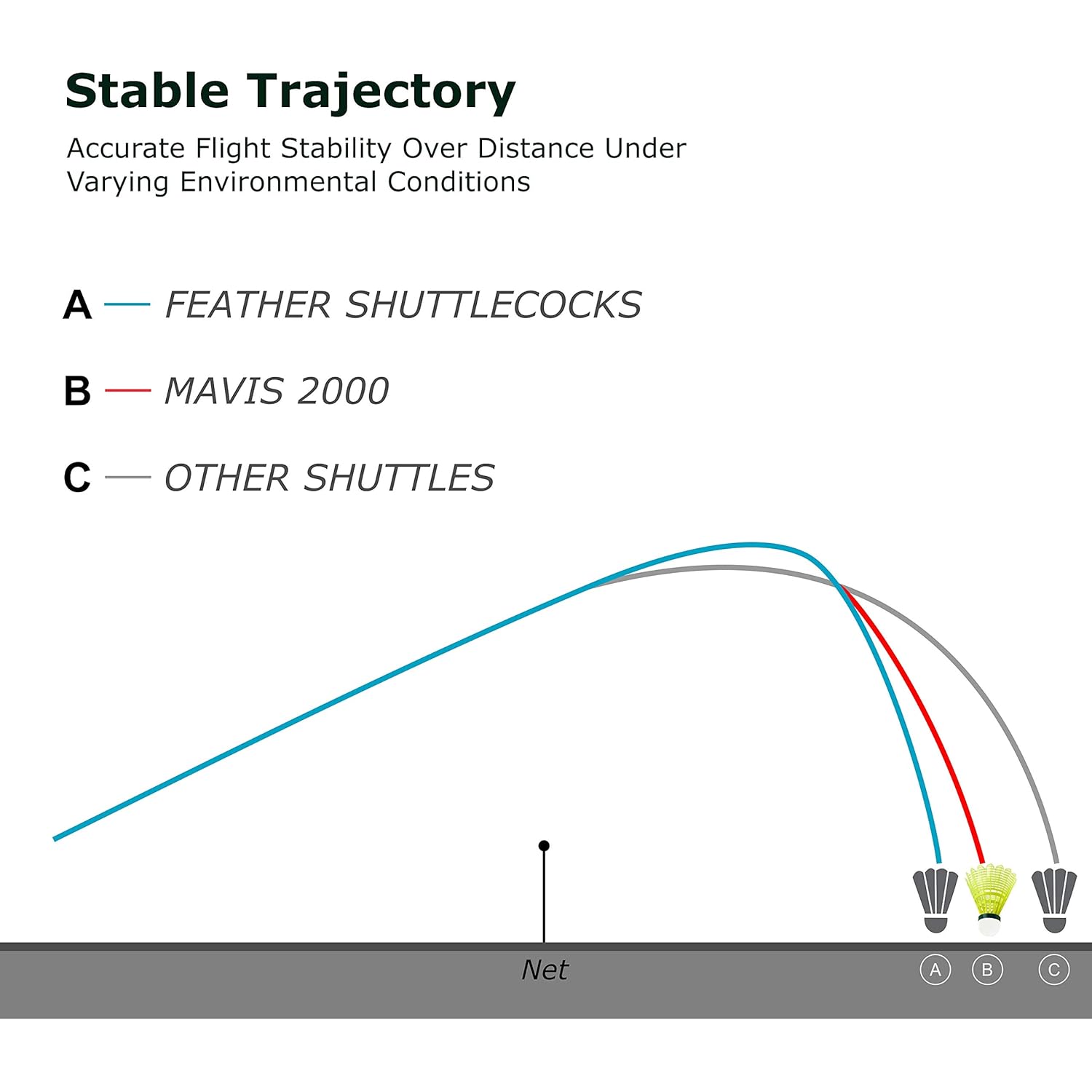 - Wing Rib design utilizes air flow through the shuttlecock to restore shape quickly on impact.
